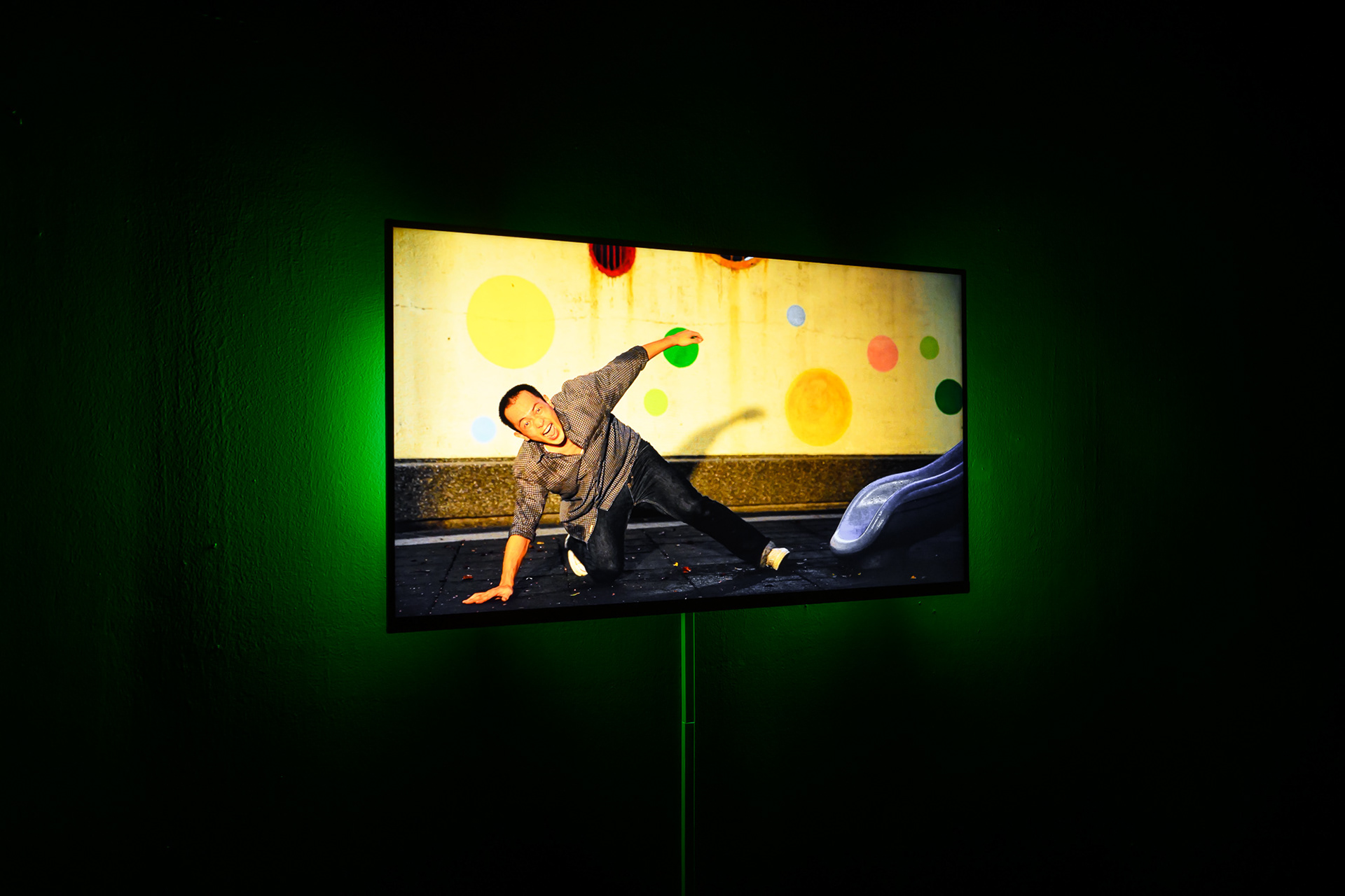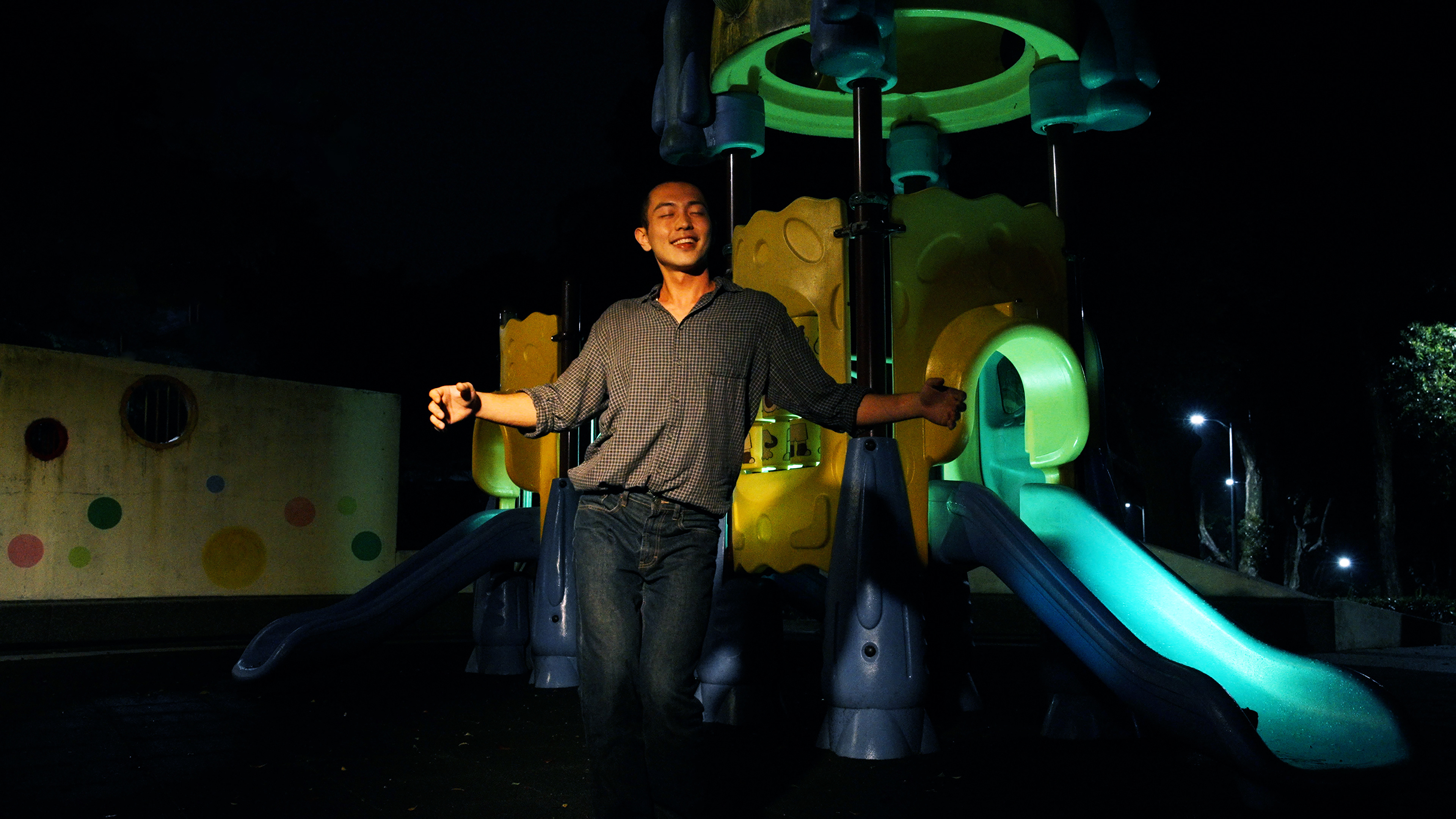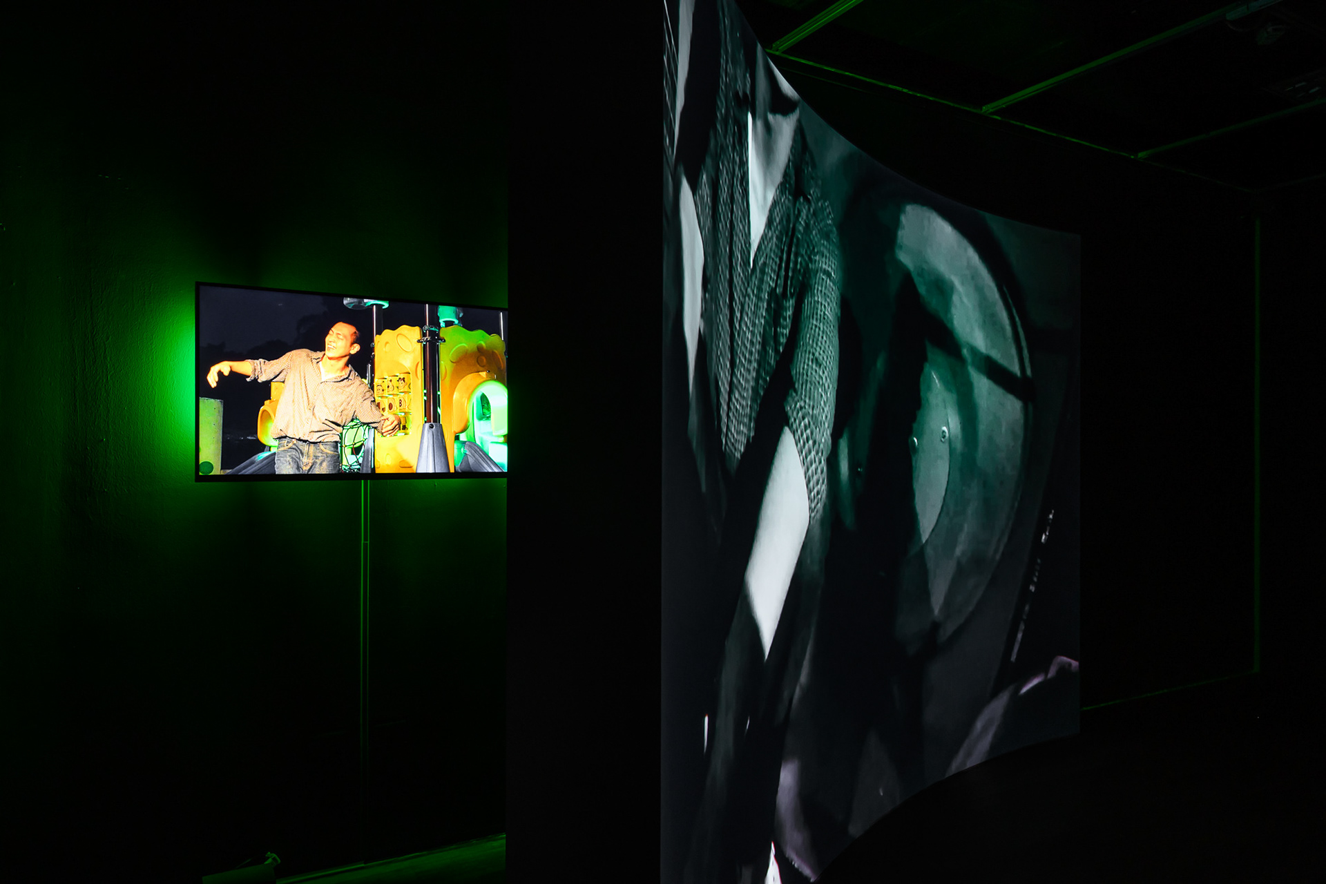 《午夜遊樂場》以城市中的公園為主要背景,同時指涉公園在白天與夜晚所展現出的、兩種全然迥異的空間性質,以及一段銘刻於地景的公共記憶。在作品中,藝術家楊傑懷和呂柏勳賦予公園不同的記憶與地方性——它既是遊戲空間,也是同志聚集地點。他們試圖以重演(Reenactment)的手法描繪潛伏在公共場域之下的異質性,展場透過公園常見的塑膠遊樂設施物件、聲音、影像裝置,召喚觀眾在公園的身體感和視覺經驗,並將展場部署為一個劇場式的影像空間。